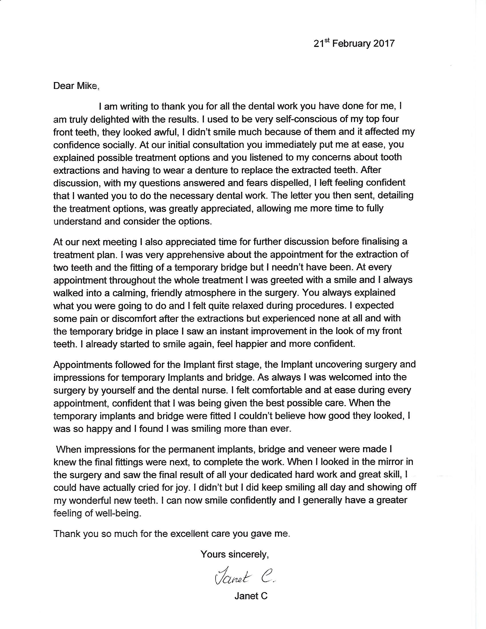 My dentist takes time to make sure I am coping with the treatment. I feel cared for as an individual and the treatment is so deft and efficiently done. I am always advised on how to care for my very elderly teeth in the best way.